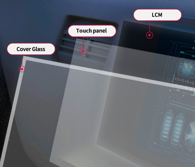 Provide various display parts and required solutions including Lens (Cover, HUD), Display (LCD, OLED, Segment), Touch, and Optical Bonding needed for vehicles